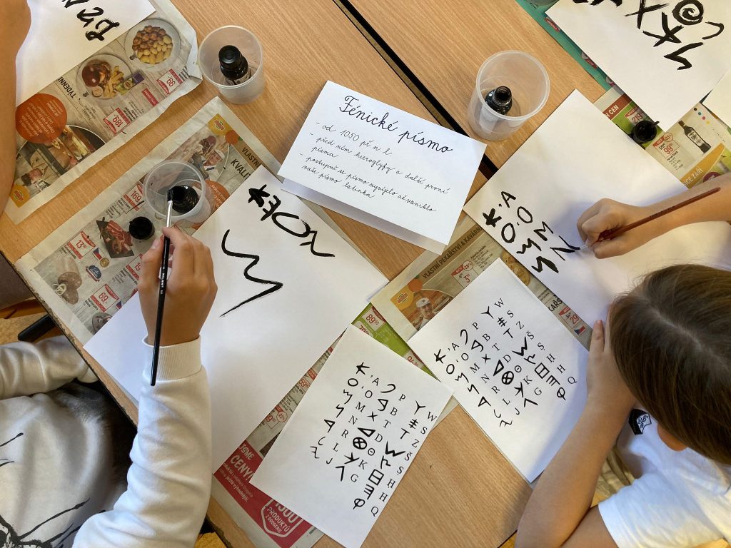 Žasli jsme nad tím, že se už tehdy lidé snažili rozvíjet obory jako je matematika, geometrie, lékařství nebo astronomie. Dozvěděli jsme se, co byla Jantarová stezka a proč dostala tak libozvučné jméno, i s čím vším se již v době starověku obchodovalo. Bavilo nás vyhledávat ve skupinkách, čím se odlišovaly kultury v Egyptě, Řecku, Římě, Indii či na Krétě, ale i to, co měly tyto civilizace společného. Usoudili jsme, že mnohé státy měly potřebu vymyslet a zdokonalovat písmo jako další formu komunikace. Nahlédli jsme tedy, jak vypadaly hieroglyfy, klínové písmo i mnohá obrázková písma. Na vlastní oči jsme si mohli prohlédnout papyrus jako jeden z materiálů, na který se písmo zaznamenávalo. Nakonec jsme si v tvořivé dílně vyzkoušeli pomocí tuše a štětce, jak asi vznikalo hláskové fénické písmo.
