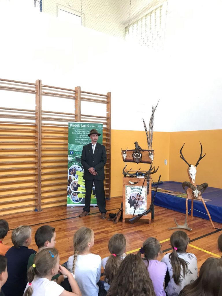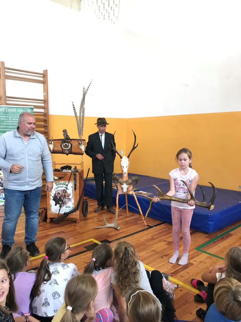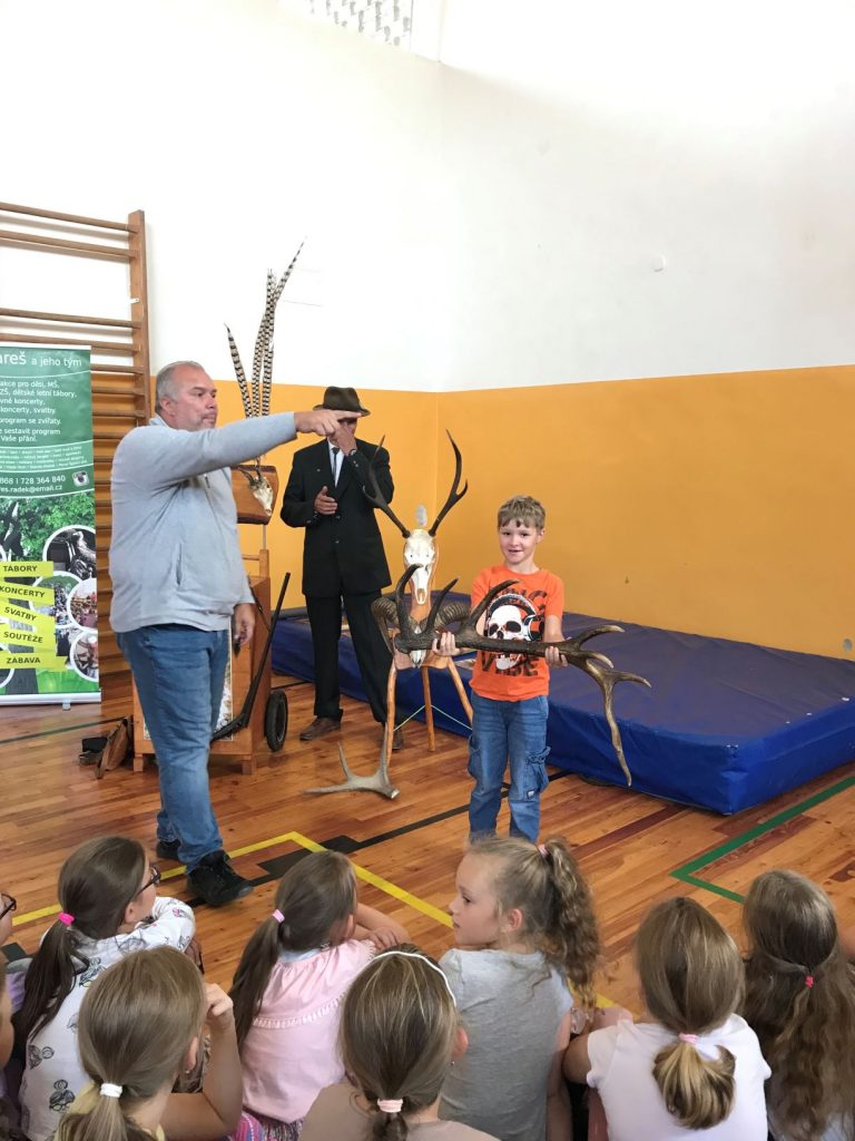 Dne 13.9.2022 k nám opět zavítal tým pana Radka Jaroše, tentokrát s kolegou myslivcem, panem Ludvíkem Hasíkem, jenž nás prostřednictvím mysliveckých trofejí, obrázků zvířat a různých mysliveckých potřeb přenesl alespoň pomyslně na malou chvíli do lesa plného zvuků jeho obyvatel. Na úvod jsme se pozdravili po myslivecku: „Myslivosti zdar!“ Nechyběla osvěta o chování v lese, zejména jak zacházet s odpadky, dodržování co největšího ticha, abychom zvířátkům dopřáli klid na pastvu či odpočinek. Dozvěděli jsme se něco málo o historii myslivosti u nás, jejímž průkopníkem byl např. Karel IV., který jako jeden z prvních v našich lesích zakládal obory s vysokou zvěří. Na našeho nejslavnějšího krále jsme navázali opět králem, který ovšem panuje v našich lesích a oborách, jím je totiž jelen evropský. Mohli jsme si zblízka prohlédnout a též potěžkat jeho paroží, kterým se pyšní pouze samci a dále jsme se dozvěděli, že výrůstkům se říká výsady a nejvyšší patro se nazývá koruna. Děti se nenechaly nachytat kvízem, jak se nazývá samice od jelena (laň) či jak se nazývá jejich mládě (kolouch). Věděli byste ovšem, co jsou to páráky a klektáky? My si je mohli dokonce osahat a od pana Hasíka víme, že takto myslivci nazývají spodní a horní špičáky (též zbraně) kňourů, tedy samce prasete divokého. A o kom se myslivci baví, když zahlédnou frišle? Že nevíte? My už ano, je to sele nám již známého prasete divokého. Další zajímavou trofejí byly těžké toulce (rohy) muflona či dlouhé ocasní pero bažanta. Pan myslivec nám též předvedl a vysvětlil, co jsou to vábničky a k čemu se používají. Největším zážitkem a tečkou celého programu byla bezesporu ukázka atrapy lovecké brokovnice.  Dětem se celý program moc líbil a už nyní se těší na další zážitky.