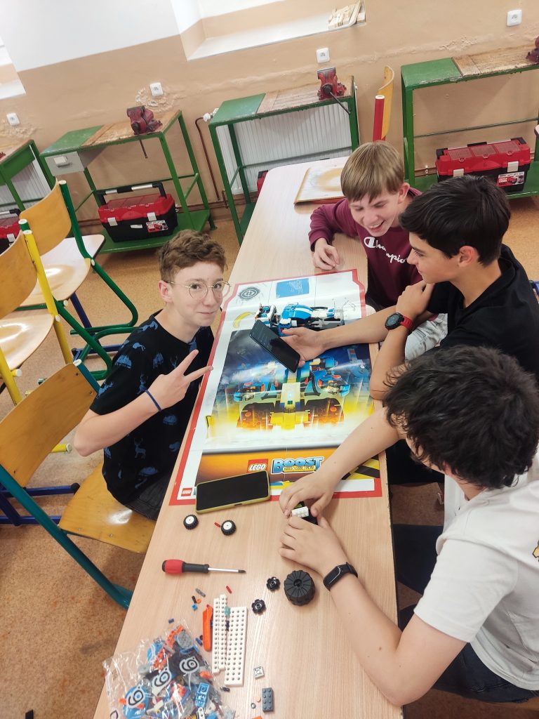 Poslední hodinu v dílnách jsme měli hotové vše, co jsme měli stihnout. Vzali jsme si tedy Lego stavebnice Boost a postavili si malé roboty. Ve stavebnicích není klasický návod a ke stavění je potřeba si stáhnout aplikaci do telefonu nebo do tabletu. Tím začal náš první dnešní úkol. Když se nám podařilo roboty postavit, propojili jsme je s aplikací a pak již stačilo zadávat příkazy, které robot poslouchal. Tato hodina byla úplně jiná, než předchozí hodiny dílen, ale moc se nám líbila. Sice se nám vše nedařilo hned na první pokus, ale už se těšíme na září, na hodiny informatiky, kdy se k Legu zase vrátíme.