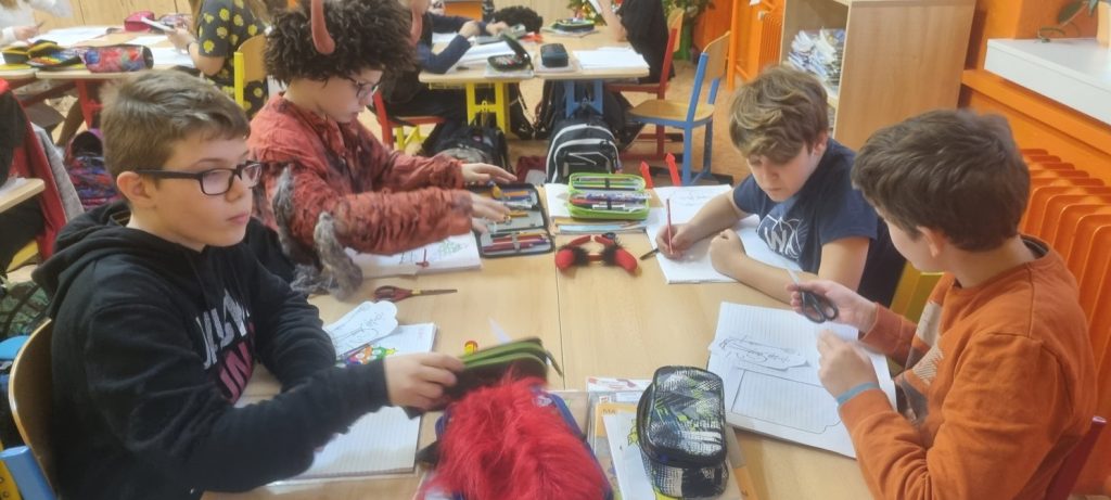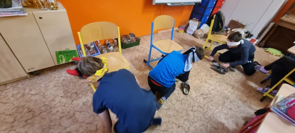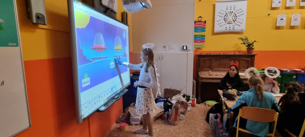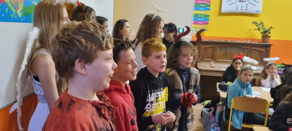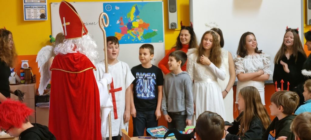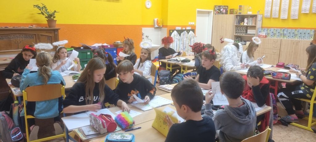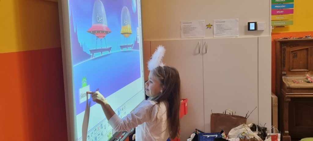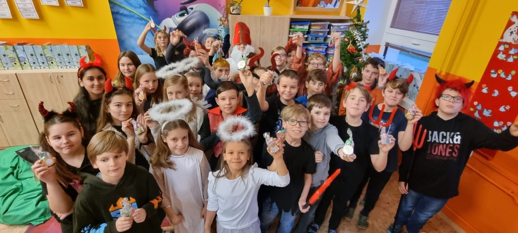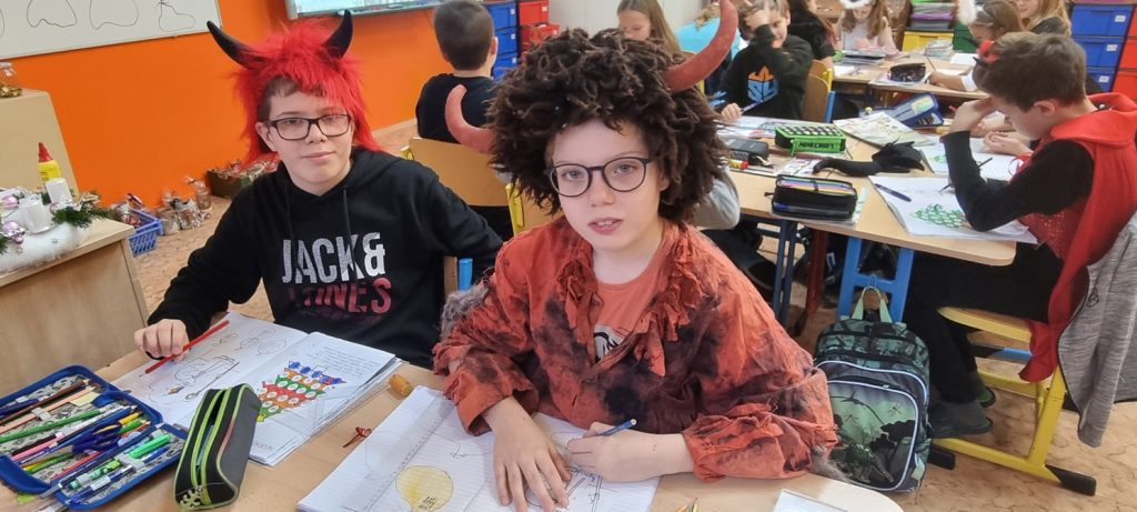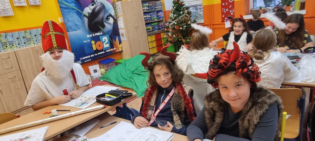 V pondělí 5. prosince se to ve škole čerty, anděly a Mikuláši jen hemžilo. Počítali jsme čertí slovní úlohy, skládali slova z písmen, luštili křížovku a soutěžili. To se nám líbilo nejvíce. Obout pantofle židli se zavázanýma očima byla vážně legrace. Nepřišli jsme ani o mininadílku a čertovské peklo. Čertovský den jsme letos poprvé užili beze strachu všichni, přece jen jsme už páťáci J.