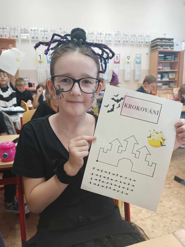 Další částí našeho programu byla stezka, na které jsme museli správně doplňovat tvrdé a měkké souhlásky. Každé správné slovo nám pomohlo získat tajenku. Bylo to nejen zábavné, ale také poučné. Nezapomněli jsme ani na opakování násobilky, tentokrát zašifrované. A aby toho nebylo málo, pomocí krokování jsme nakreslili obrázky a vytvořili svá vlastní strašidýlka.
