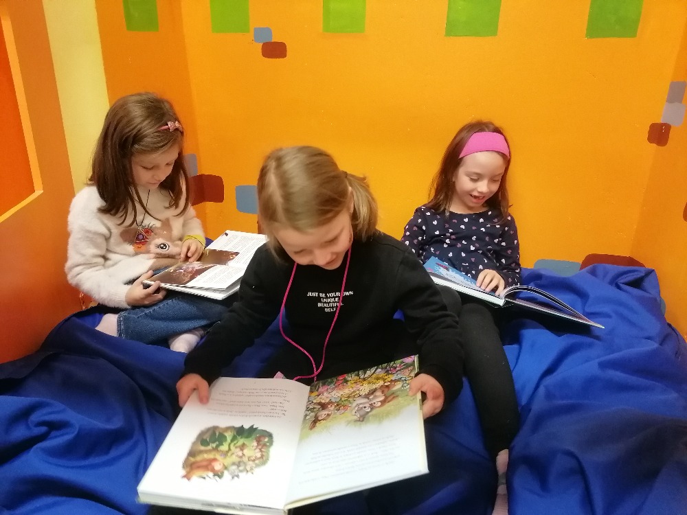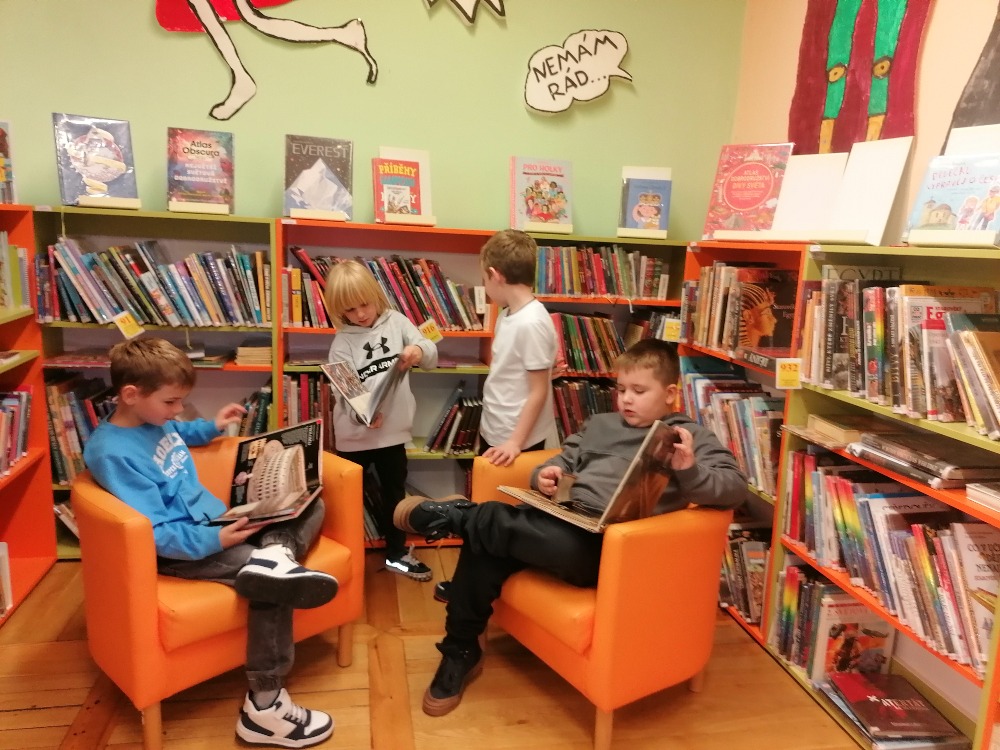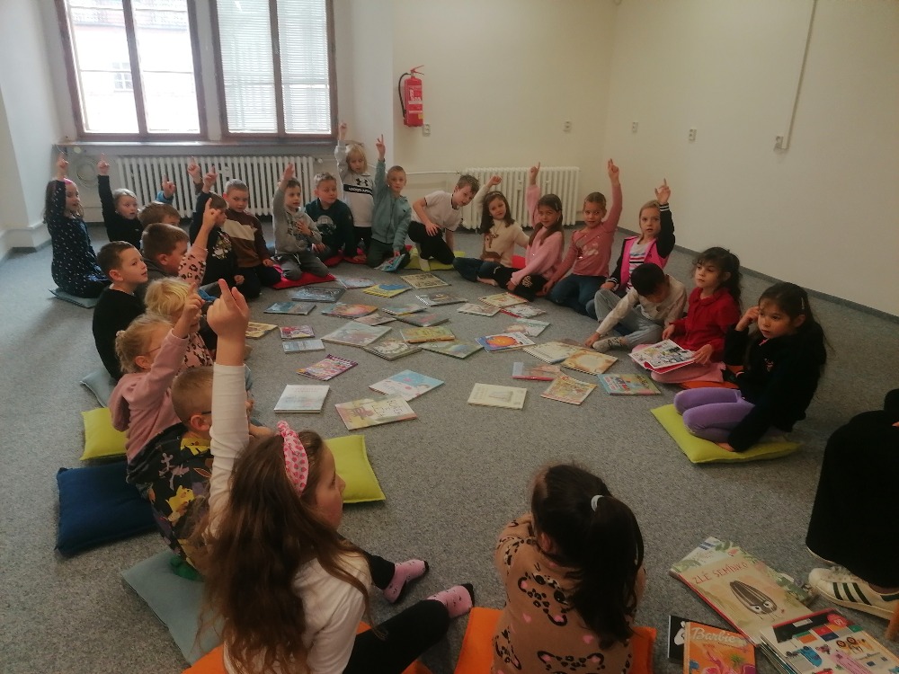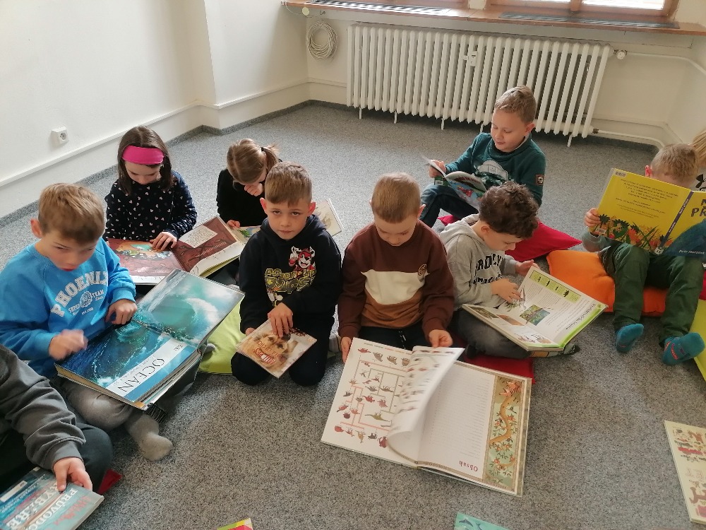 Společně poprvé jsme si vyrazili do chomutovské knihovny na besedu, která pro nás byla ukázkou zajímavých knížek, Například o dinosaurech, princeznách, strojích, o roztomilých zvířátkách a všelijakých zajímavostech. Nejprve nám paní knihovnice připomněla chování nejen ke knihám, ale i k sobě samotným… A poté už jsme se vydali na putování za knížkami. Každý si našel svou oblíbenou a zalezl si na své místečko, které mu zrovna v knihovně připadalo nejvíce sympatické, příjemné, no prostě ideální na chvilku pro sebe a s knížkou v ruce. Pak jsme se nasvačili a vypravili se na cestu zpět do školy. Zveme vás všechny na malou fotogalerii našich knihovnických zážitků.