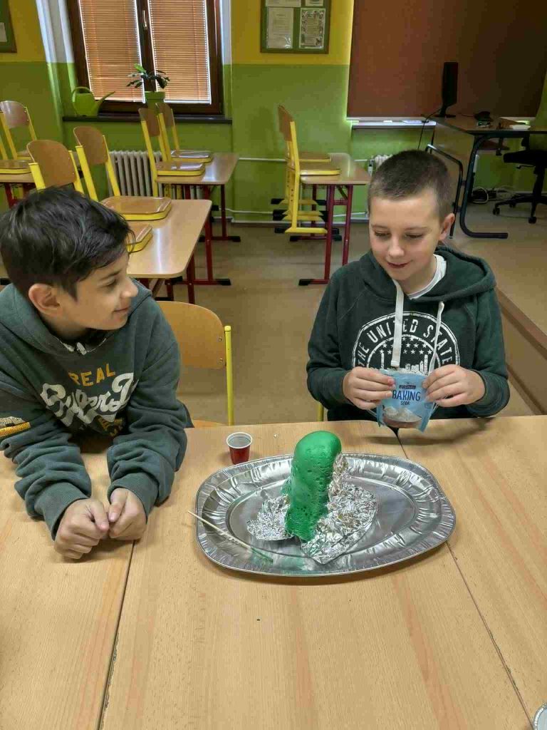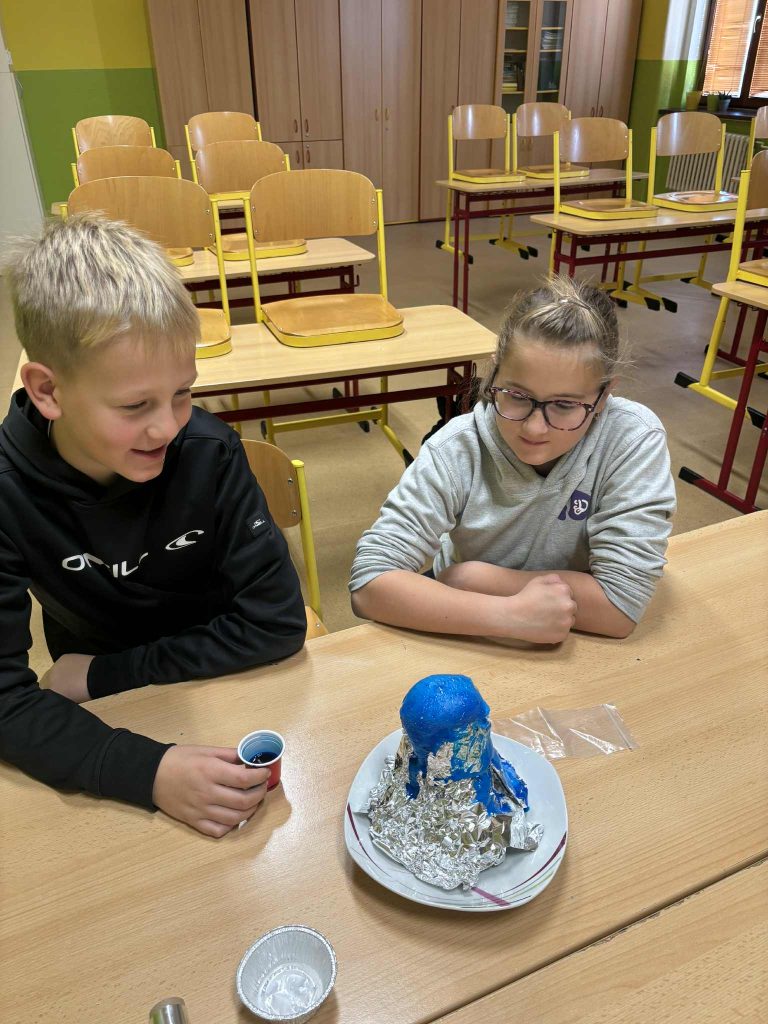 V pondělí 20. října jsme si na kroužku vyzkoušeli jeden z nejzábavnějších pokusů – výbuch sopky. Žáci si pomocí zavařovacích sklenic a alobalu vytvořili své vlastní sopky a pak už jen stačilo přidat pár ingrediencí: jedlou sodu, ocet, trochu saponátu a potravinářské barvivo. Když došlo ke smíchání všech ingrediencí, začala ze sopek vytékat láva v nejrůznějších barvách. Žáci s nadšením pozorovali, jak se jejich sopky probouzejí k životu a přitom bádali, k jakým chemickým reakcím dochází. Pokus se nám vydařil a všechny nás velmi bavil.