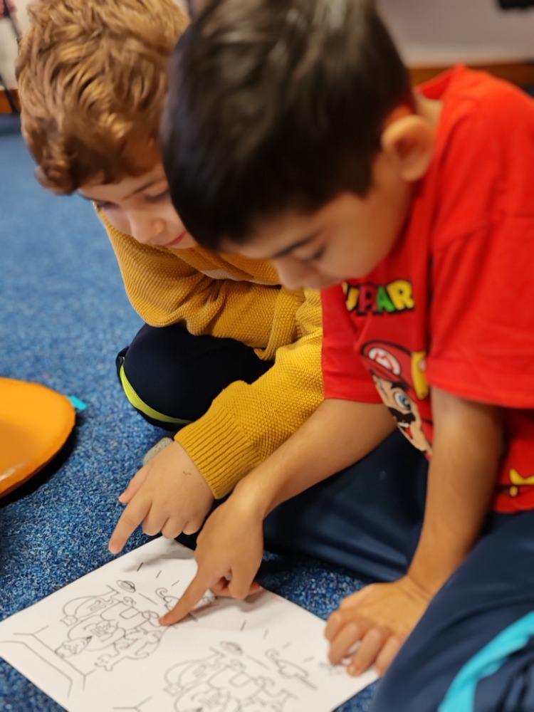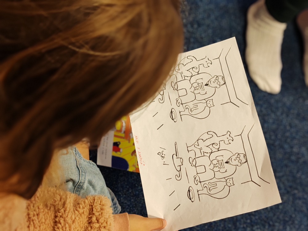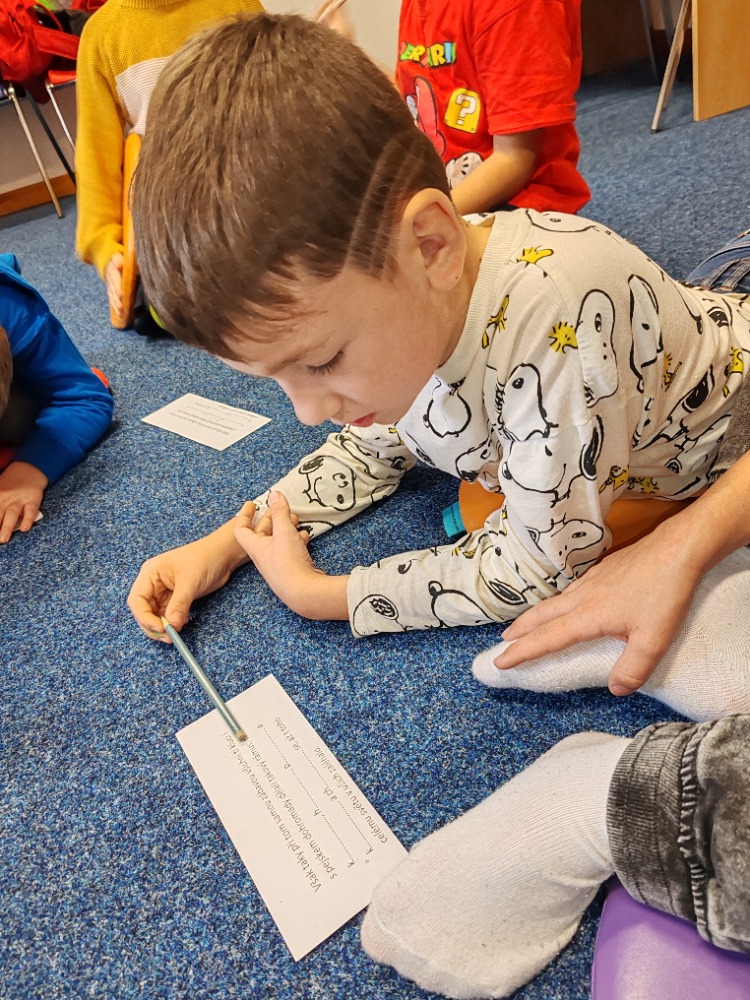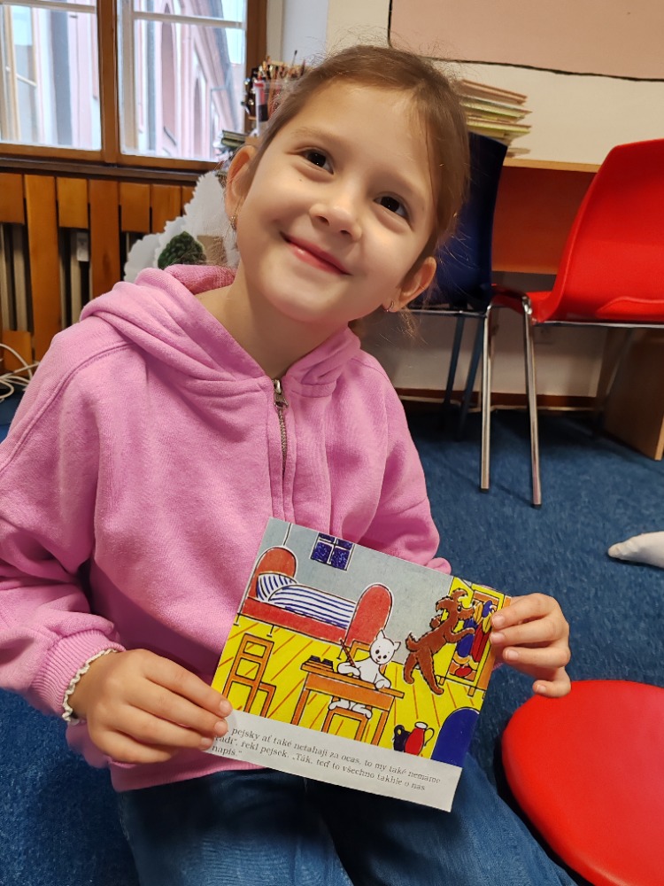 Prohlédli jsme si i krásné ilustrace, které autor sám nakreslil, a zkusili jsme vyhledávat v textu důležité informace. Při tom jsme si procvičili práci s knihou a čtenářskou pozornost. Poté jsme si zahráli hru na hledání rozdílů mezi obrázky z knihy – trénovali jsme postřeh a všímavost. Zároveň jsme si pověděli o správném chování k pejskům a kočičkám.