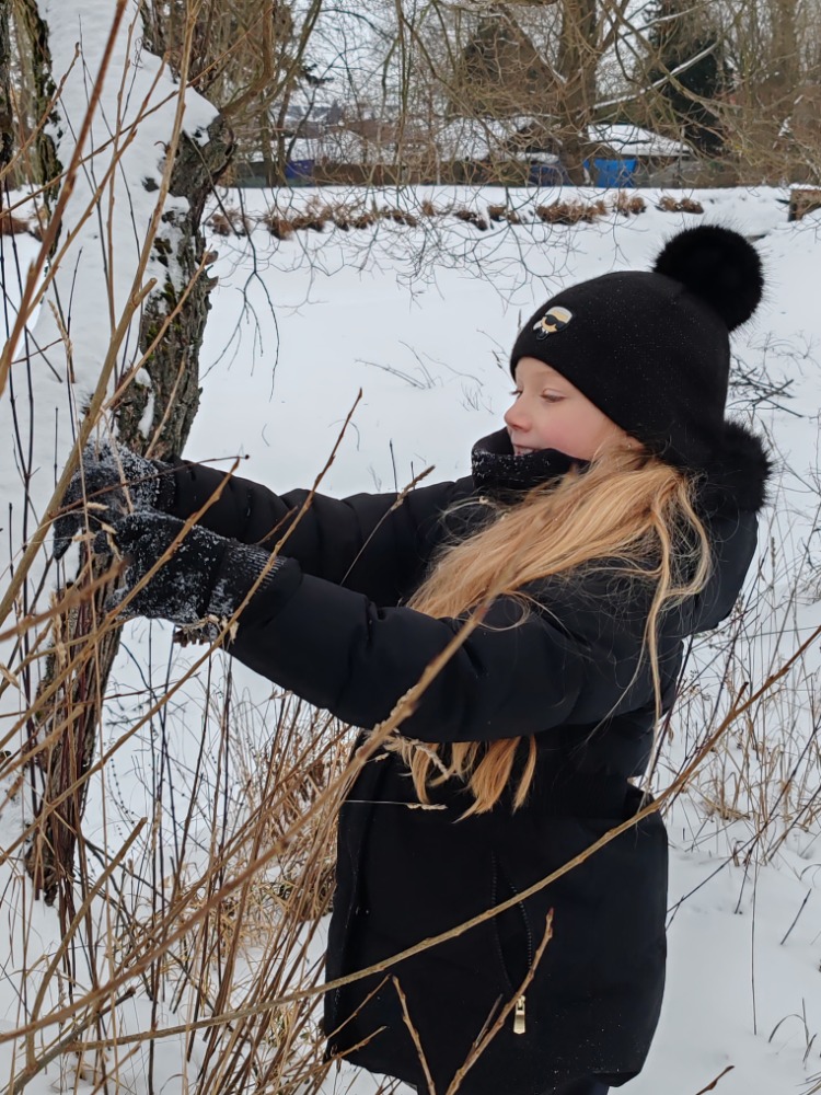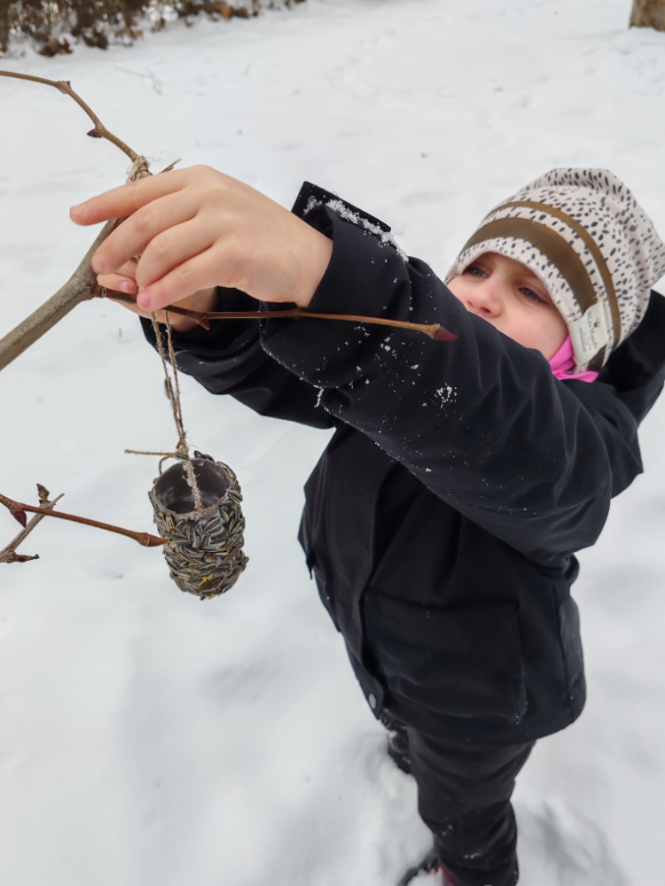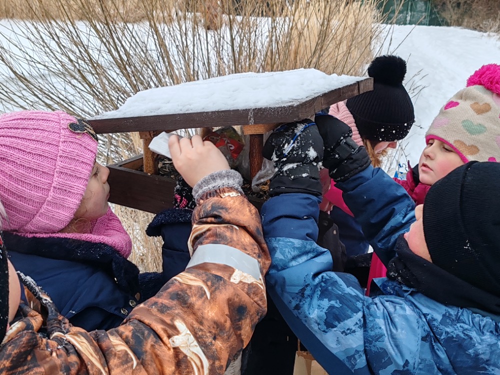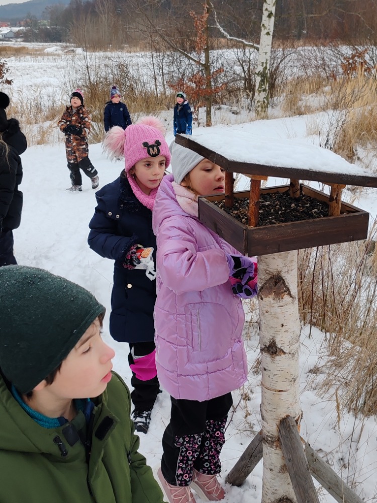 Poté jsme se vydali na vycházku, kde jsme pozorovali ptáčky, zavěšovali krmení na stromy a sledovali krmítko. Na poli jsme objevovali stopy zvířat ve sněhu a užili si spoustu zimních radovánek. Děti si hrály na sněhu, vtlačovaly sníh do kůry stromů a vytvářely z něj obrázky. Nechyběla ani zábava v podobě hodu sněhových koulí do zamrzlého rybníka.