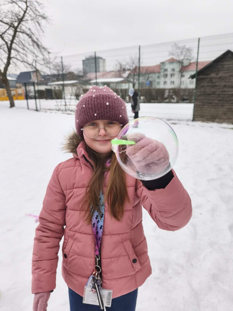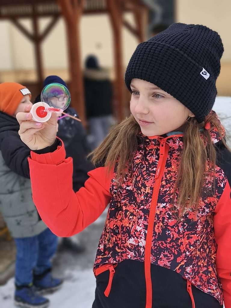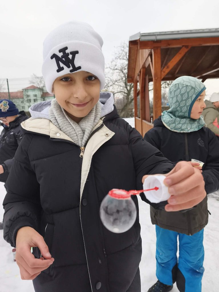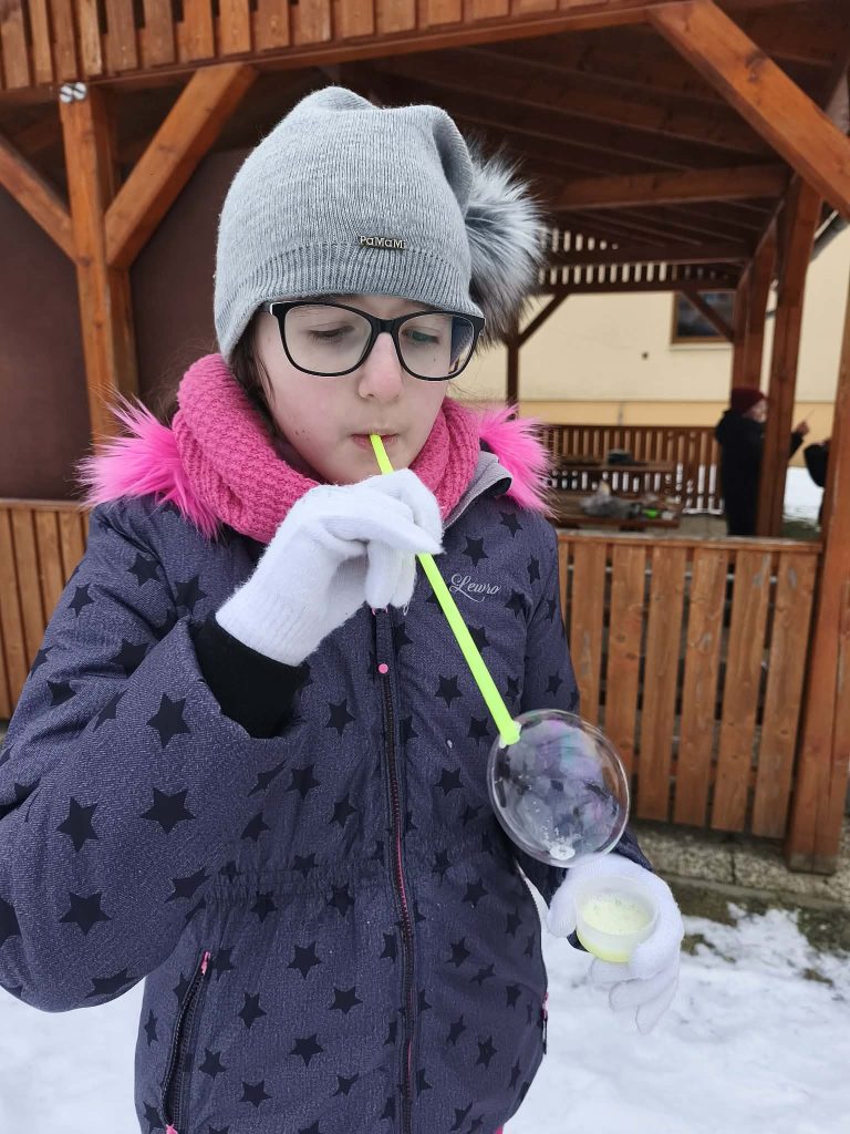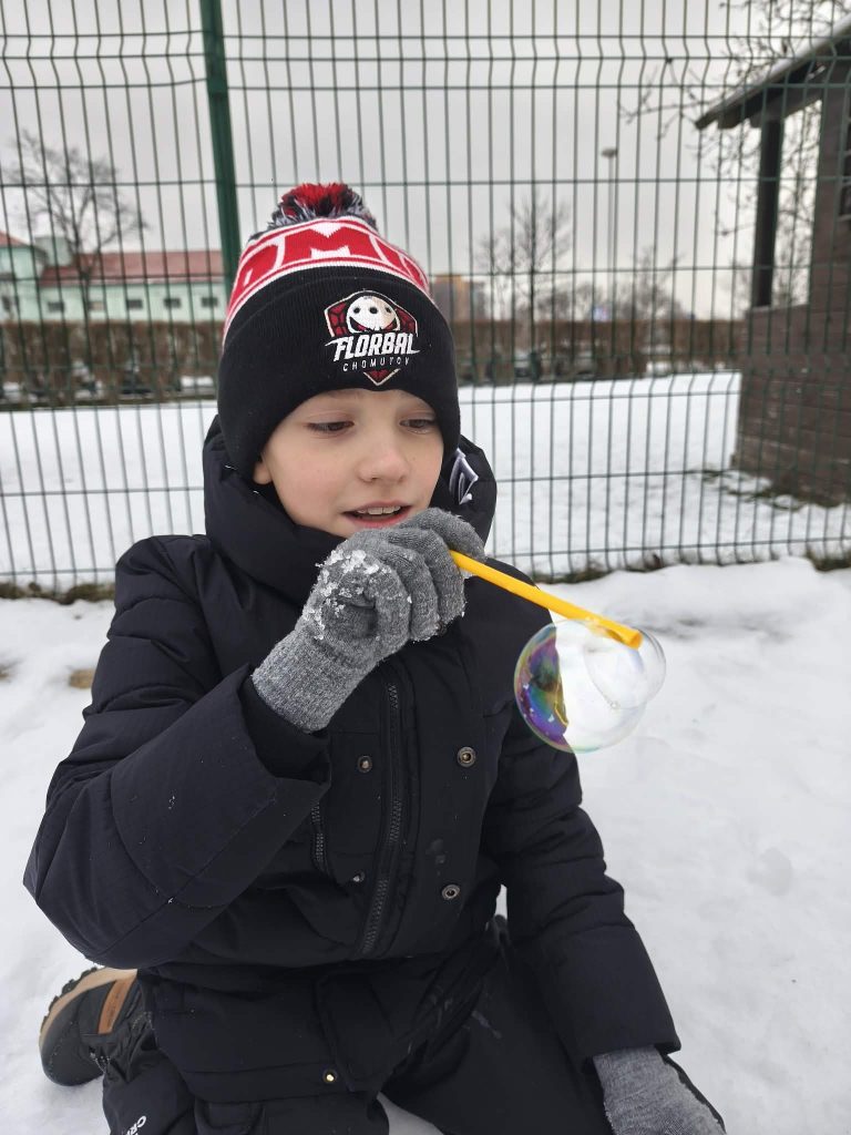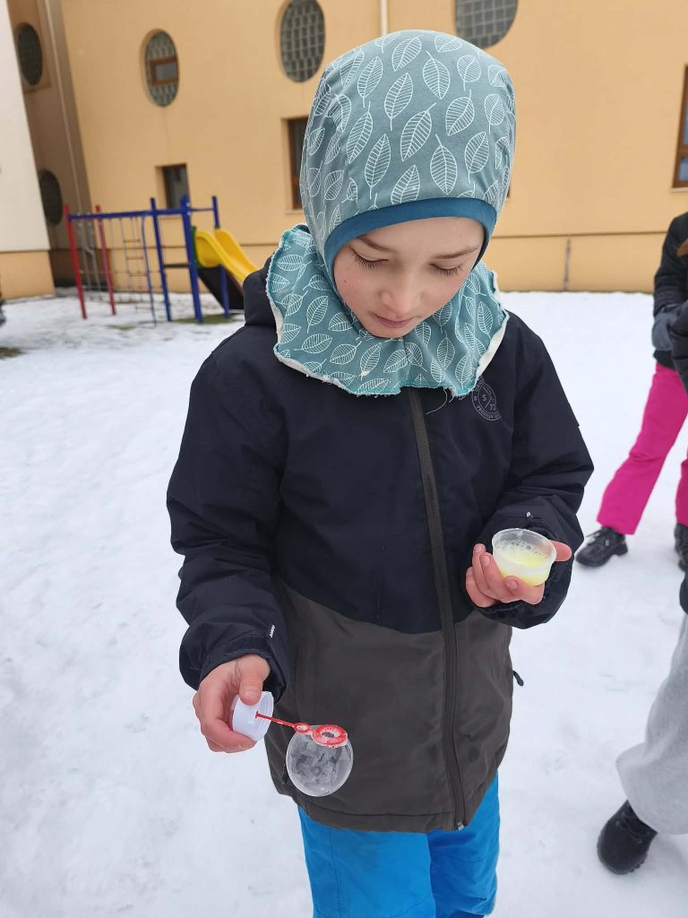 Ve čtvrtek 22. ledna se třída 4. B v rámci pracovních činností pustila do malého zimního experimentování. Tentokrát se žáci proměnili v malé objevitele a umělce a pustili se do tvoření zmrzlých bublin. Využili mrazivého počasí a s nadšením sledovali, jak se obyčejné mýdlové bubliny před jejich očima mění v křehká ledová umělecká díla.
