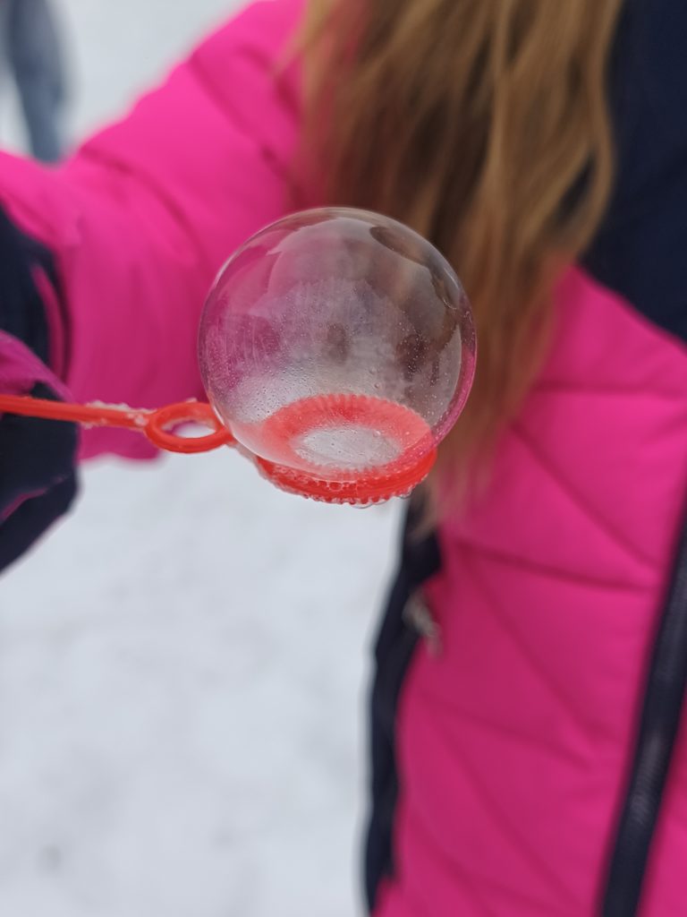 Děti foukaly bubliny s velkou pečlivostí a trpělivě pozorovaly, jak se na jejich povrchu postupně objevují nádherné ledové vzory. Pro tuto aktivitu jsme si vyrobily speciální bublinovou směs, díky které se bubliny lépe tvořily a krásně mrzly. Každá bublina byla jiná a originální, stejně jako nápady samotných žáků.