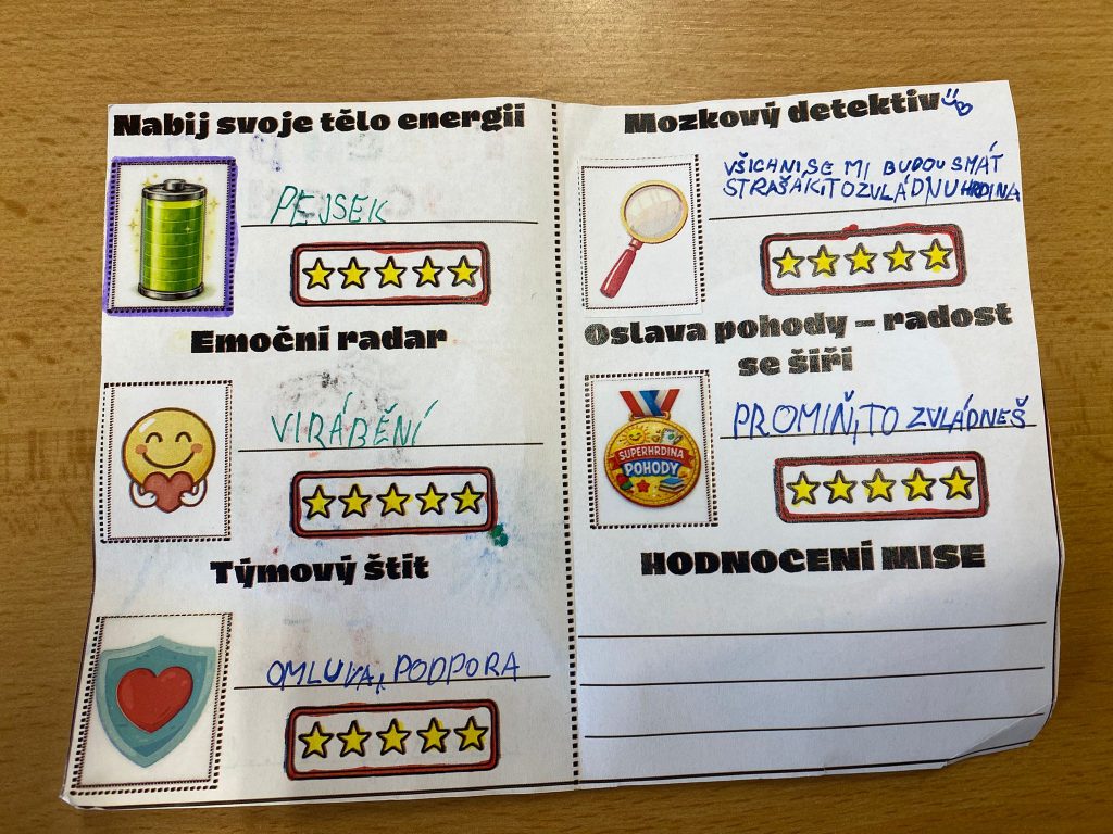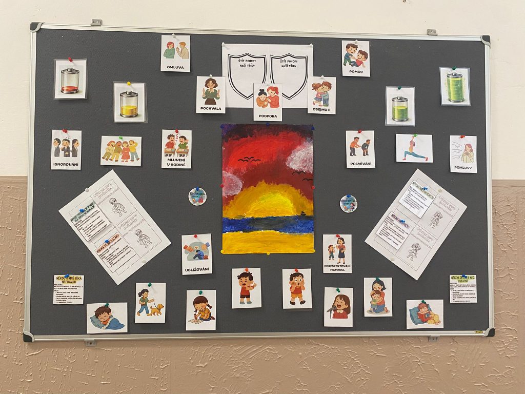 V rámci toho jsme si po celý týden povídali o tom, co nás nabíjí, co nás naopak vycucává a jak bychom se k sobě měli chovat, aby nám bylo ve škole dobře.