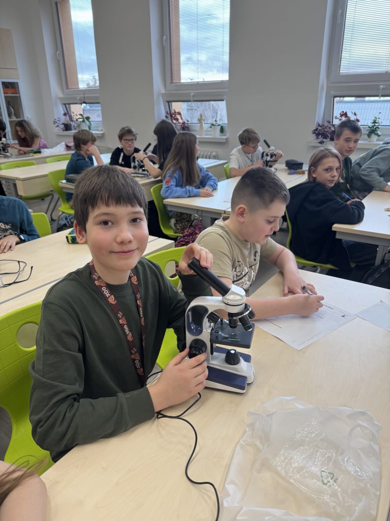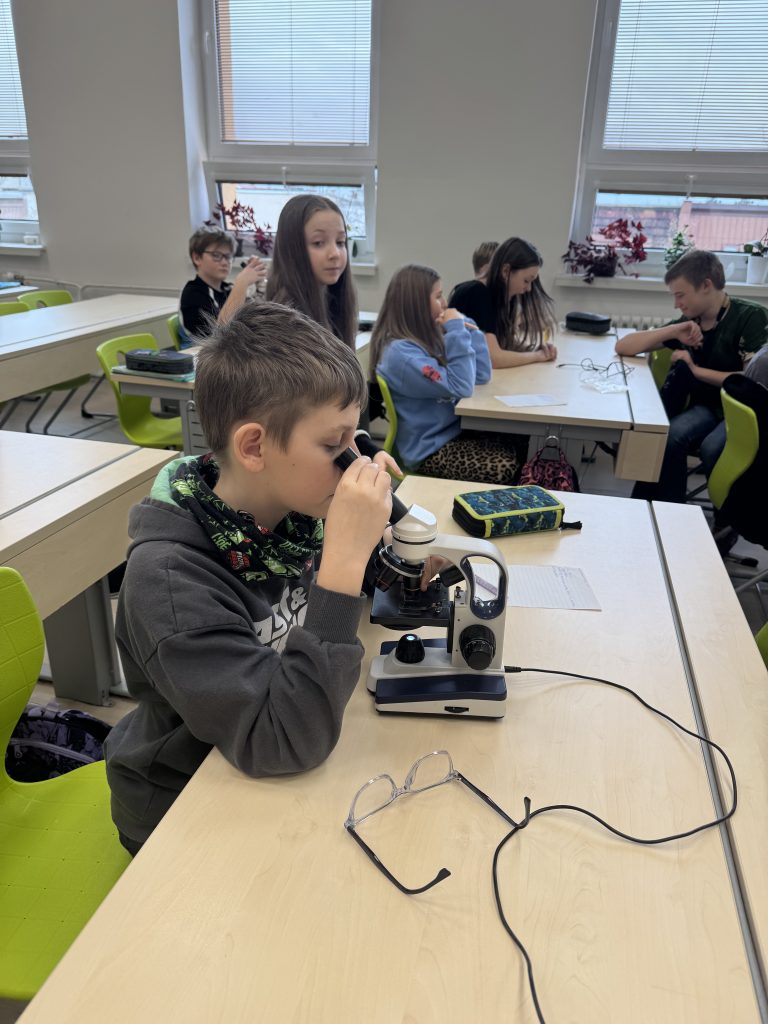 Ve třídě panovalo soustředění i nadšení z objevování. Pod mikroskopem se podařilo pozorovat například trepky (nálevníky) a vířníky. Společně jsme porovnávali jejich stavbu těla, způsob pohybu a diskutovali o rozdílech mezi nimi.