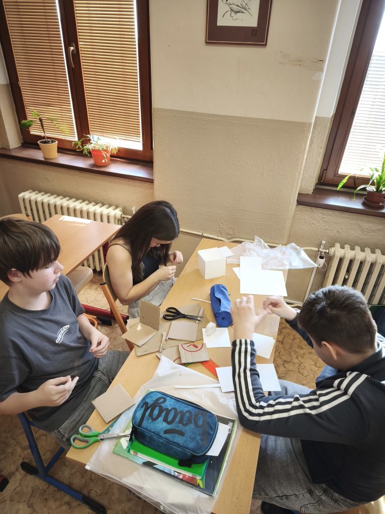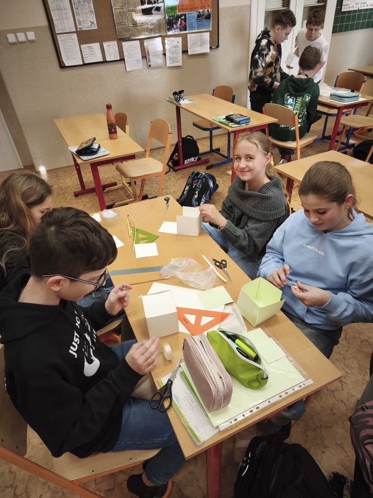V hodině fyziky čekal šesťáky neobvyklý úkol. Nejprve jsme si společně připomněli, co je to krychle a co všechno už víme o objemu. Úkolem bylo vyrobit z kartonu krychli, která bude mít délku hrany přesně 1 decimetr. Žáci si tedy pravítky naměřili čtverce o straně 10 centimetrů, vystřihli je a pomocí izolepy slepili dohromady. Postupně tak vznikla kartonová krychle.