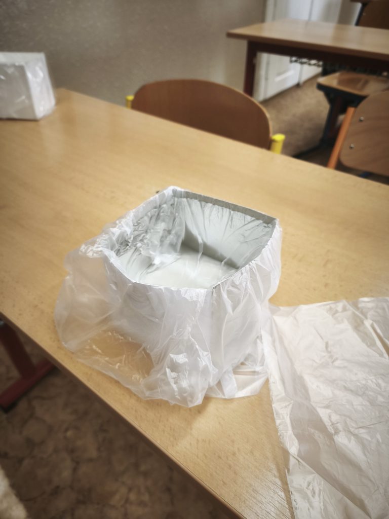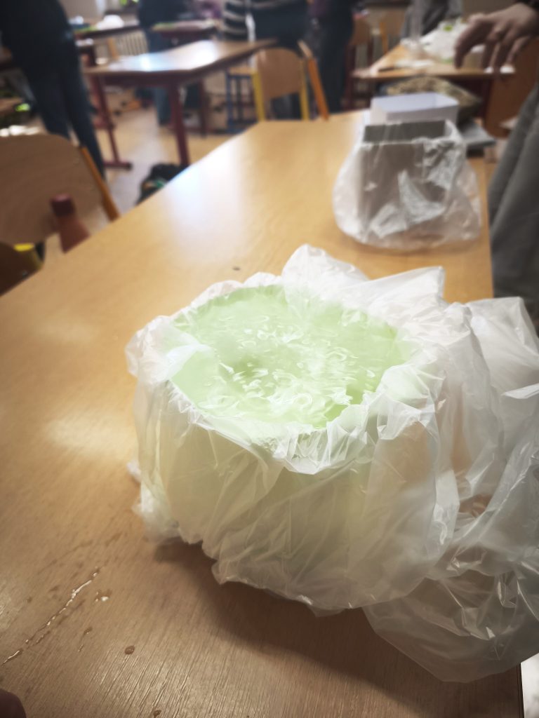Protože karton není vodotěsný, vložili dovnitř ještě igelitový pytlík, který měl zajistit, že voda neproteče ven. Když byla krychle hotová, přišla ta nejzajímavější část pokusu.