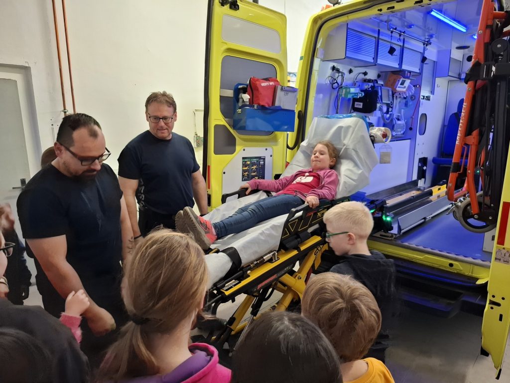 Prohlédli jsme si sanitní vůz zevnitř i zvenku. Zjistili jsme, že to není jen auto, ale vlastně taková malá pojízdná nemocnice plná přístrojů, batohů a léků. Záchranáři nám také ukázali, jak vlastně zraněného do auta nakládají a co jim pomáhá.