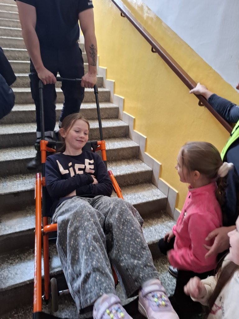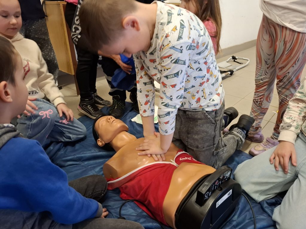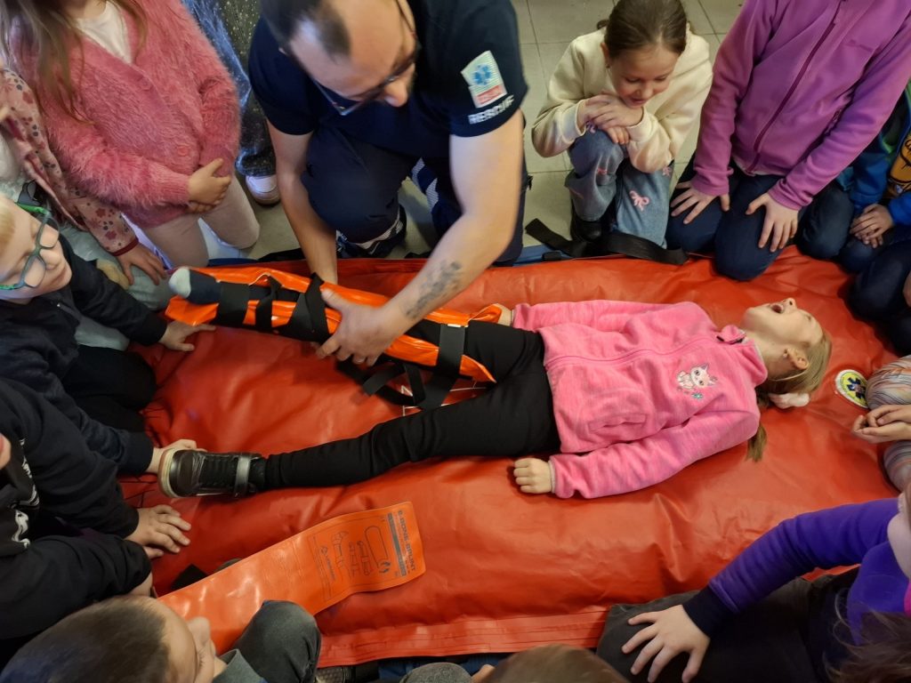Na odborné figuríně si každý zkusil, jak náročná je nepřímá masáž srdce. Zjistili jsme, že udržet správné tempo je velice náročné. Vyzkoušeli jsme si, jak se znehybňuje zlomená ruka nebo noha pomocí speciálních nafukovacích dlah, jak se přepravuje zraněný člověk. Záchranáři nám také ukázali schodolez a povozili nás po schodech dolů.