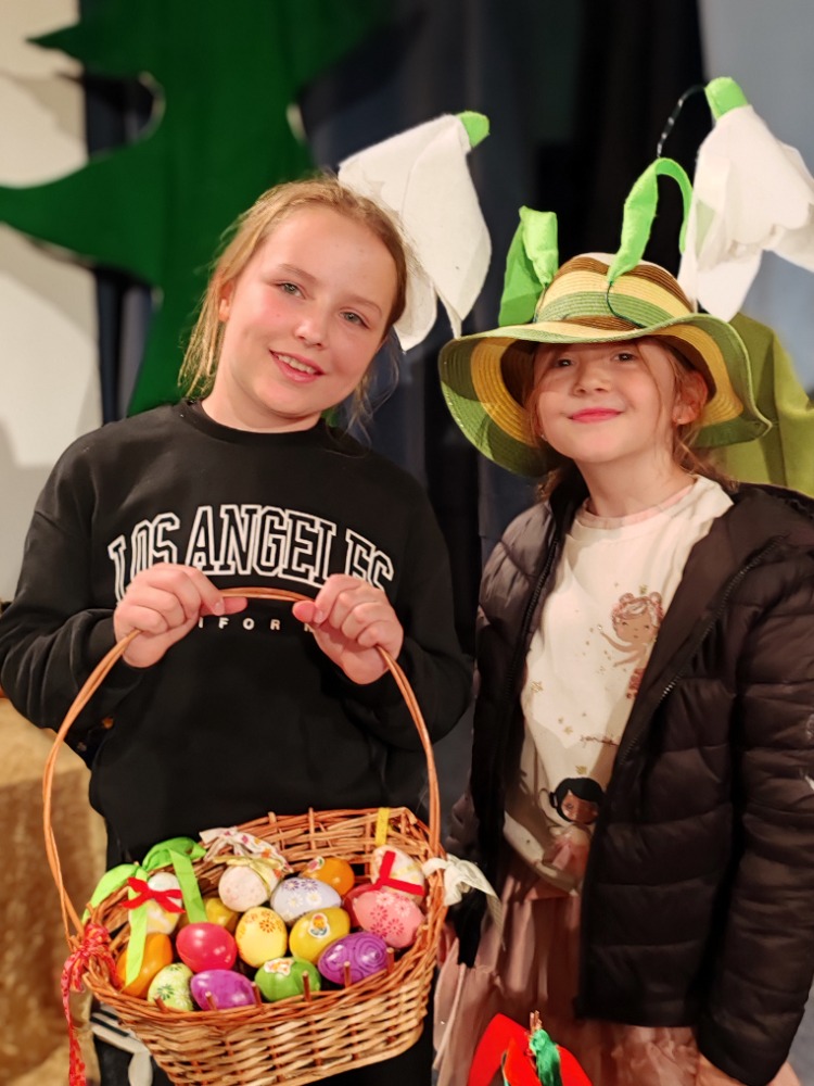 Děti se během představení nejen dívaly, ale také aktivně zapojovaly. Poslechly si známé i nové písničky o jaru, tleskaly do rytmu a dokonce si i zatančily. Atmosféra byla plná radosti, smíchu a nadšení. Žáci si zopakovali jarní květiny, přiletěl za námi čáp a vlaštovky. Nakrmili jsme ptačí mláďata a královna jara vykouzlila i čarodějnice a velikonoční zajíčky.